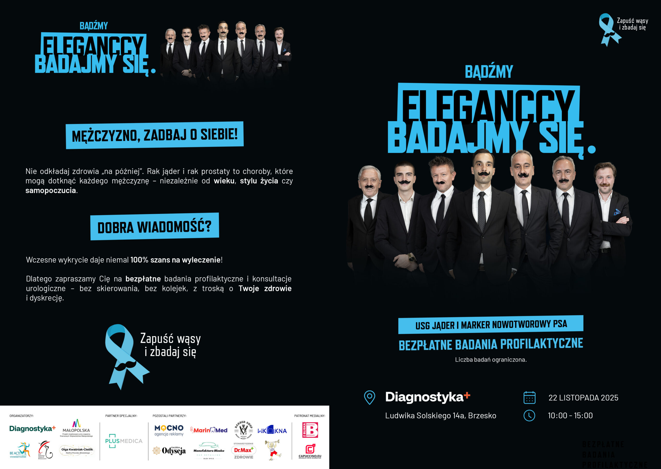 22 listopada w godzinach 10:00 – 15:00 w Punkcie Diagnostyki przy Galerii Odyseja w Brzesku odbędzie się akcja bezpłatnych badań profilaktycznych dedykowanych mężczyznom. Jest to już czwarte wydarzenie organizowane corocznie w ramach kampanii Movember — międzynarodowej inicjatywy, której celem jest zwiększanie świadomości na temat zdrowia mężczyzn, ze szczególnym uwzględnieniem nowotworów prostaty i jąder. Movember zachęca mężczyzn na całym świecie do podejmowania rozmów o zdrowiu, przełamywania tabu oraz regularnej profilaktyki, która ma realny wpływ na wydłużenie i jakość życia. W ramach naszej akcji uczestnicy będą mogli skorzystać z bezpłatnego badania USG jąder oraz oznaczenia poziomu markera nowotworowego PSA. Badania skierowane są do wszystkich pełnoletnich mężczyzn, bez ograniczeń wiekowych. Liczba badań jest ograniczona, a o udziale decyduje kolejność przybycia. Dla pierwszych uczestników przygotowaliśmy również upominki od naszych sponsorów, jako drobne podziękowanie za troskę o własne zdrowie.